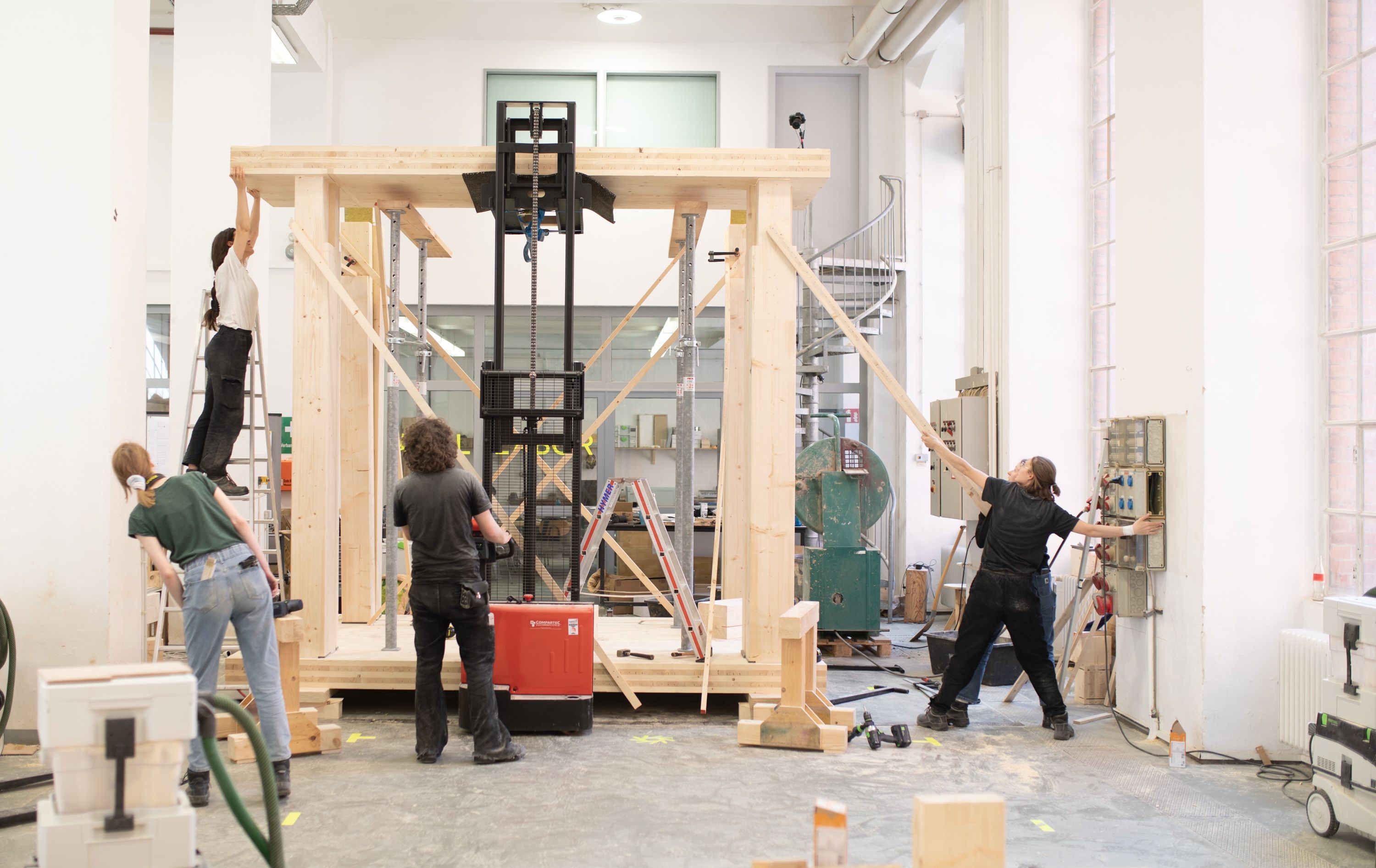 We have to take action. And we do it. Every day and in every decision. Almost 40% of global CO2 emissions and over 50% of global resource consumption arise in the building sector. We can do something about that. Our 1.5° Lab researches and works on alternative materials and components so that we can build for you in a resource- and climate-friendly way. Photo: Assembly of the Woodscraper mock-up in the NBL lab.