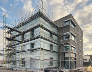 Im Auftrag der evangelischen Stiftung Schönau entstehen in Brühl bei Heidelberg vier Mehrfamilienhäuser in unterschiedlichen Holzbauweisen. Im Rahmen eines begleitenden Forschungsprojektes der Deutschen Bundesstiftung Umwelt (DBU) wird die Zukunft des Holzbaus im Mietwohnungsbau untersucht: Welche Voraussetzungen braucht diese Konstruktionsweise? Wie können “graue Energien“ beim Bauen so gering als möglich gehalten werden? Wie gelingt es für die Energieversorgung möglichst nur erneuerbare Quellen zu integrieren – und das wirtschaftlich erfolgreich? Eines der vier Gebäude plant Partner und Partner, es wird mit einer Luft-Kollektorfassade in leimfreier Massivholzkonstruktion hergestellt. Das Holz stammt zum großen Teil aus stiftungseigenem Forstbetrieb.