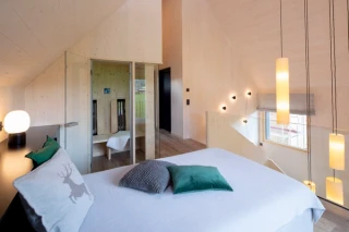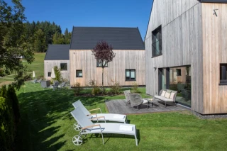In diesem Sinne wurden auf dem weitläufigen Gelände des 5-Sterne-Wellnesshotels Engel Obertal in Baiersbronn sechs zweigeschossige Chalets mit je zwei Schlafzimmern errichtet. Sie ermöglichen einen individuelleren Aufenthalt für Familien oder Gruppen im Rahmen der Infrastruktur eines 5-Sterne-Wellnesshotels. Bei der Gestaltung der Chalets spielte der Baustoff Holz eine wesentliche Rolle. Durch die Verwendung von Weißtanne für die Fassade ist es gelungen, die Neubauten schon über das Material klar im Schwarzwald zu verorten.