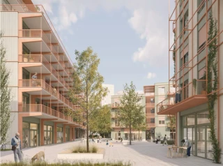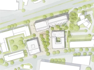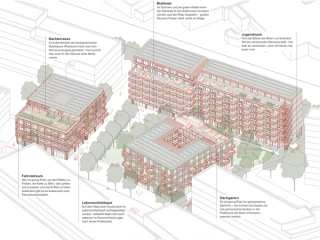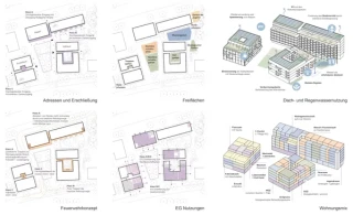 Im Hofhaus befindet sich südlich, als Schnittstelle zum Quartier und als zentraler Anlaufpunkt, das Nachbarschaftsgesundheitszentrum, angrenzend daran die Arztpraxis und das Stadtteilgesundheitszentrum, welches über einen diskreten, blickgeschützten Zugang von Osten verfügt. Die Cafeteria mit Blick auf den Spielplatz ist an den Kinderraum angebunden und orientiert sich zum Nachbarschaftsplatz. Vis-à-vis dazu befindet sich im Riegel der Multisaal, der sich zum Platz öffnet und als zentraler Treffpunkt dient. Im Punkthaus sind die genossenschaftlichen Einrichtungen wie Werkstatt, Allerleihstation, Lebensmittellager und Secondhandlager rund um die Neustart-Rezeption organisiert. Als