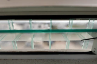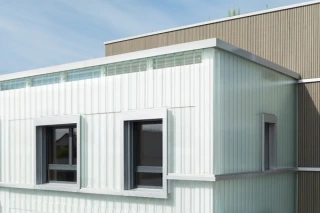 Die Glasfassade dient als Bewitterungsschicht und zugleich als aktiver Energiespeicher. Im Winter funktioniert die erwärmte Luft als transparente Wärmedämmung, und im Sommer kühlt die zirkulierende Luft die Wandoberfläche ab.