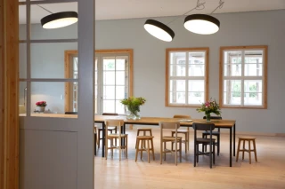 Alte Holztüren wurden aus dem Bestand behutsam ausgebaut, restauriert und an anderer Stelle wieder eingebaut. Alle Fenster wurden als Holzfenster mit 3-Fachverglasung ausgeführt. Sogar der alte Dielenboden des Dachgeschosses wurde vorsichtig herausgenommen, aufgearbeitet und als Deckenuntersicht im Erdgeschoss in Form von einer Akustikdeckenausführung wiederverwendet. Auch die die Energiezufuhr des Gebäudes wurde durch Holz gelöst. Das gesamte energiesparende Gebäude wird durch eine Pelletheizung beheizt und das Warmwasser bereitgestellt. In Baukultureller und ökologischer Verantwortung wurden bei diesem Projekt die vielseitigen Einsatzbereiche von Holz ausgereizt und zu einem harmonischen Ganzen gefügt. Das Projekt bildet somit sämtliche Potentiale und Einsatzmöglichkeiten des Baustoffs Holz in seiner ganzen Vielseitigkeit ab - 360° Holz!