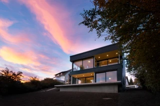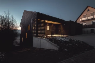 Das Gebäude besteht aus zwei ineinander gesteckte Baukörper, welche sich aus dem Wohnhaus und einer Garage zusammensetzen. Das Gebäude fügt sich durch seine Form wie von selbst in die Ortslandschaft ein und setzt gleichzeitig einen Akzent mit seiner verkohlten Holzfassade. Straßenseitig hält sich der Baukörper zurück und öffnet sich mit seinen großen Fensterausschnitten erst in Richtung Südwesten, ohne die Blicke der Nachbarn ins Haus zu lenken. Ausgewählte Materialien wie Massivholzwände- & Decken im Erdgeschoss, Sichtbetonwände im Untergeschoss, Sichtestrich als Bodenbelag, Tadelakt in den Nassbereichen im Bad und Lehmputz innenseitig an allen Außenwänden ergänzen sich harmonisch und stellen ein gutes Raumklima her. Eine Photovoltaik Anlage auf dem Dach speist Energie für die Luft-Wasser-Wärmepumpe und später das Elektroauto in der Garage.