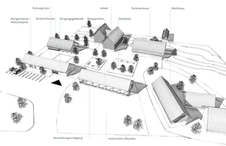 The renovation concept for the "Löwen" does not aim for a complete restoration despite its advanced decay but intends to preserve it with limited resources and create a framework for temporary uses. Key structural points will be secured, yet deficiencies will remain visible to document all phases of construction, including the destruction during the period of abandonment between the early 1970s and mid-2000s.