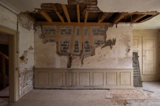 The aim is not to fully repair damages or restore the original state, but to conserve collapsed walls, ceilings, and destroyed beam ends in their current condition. This strategy results in the creation of new spatial structures, such as galleries or vistas, which keep the CO2 footprint of the project low and raise awareness of the history and value of historical buildings.