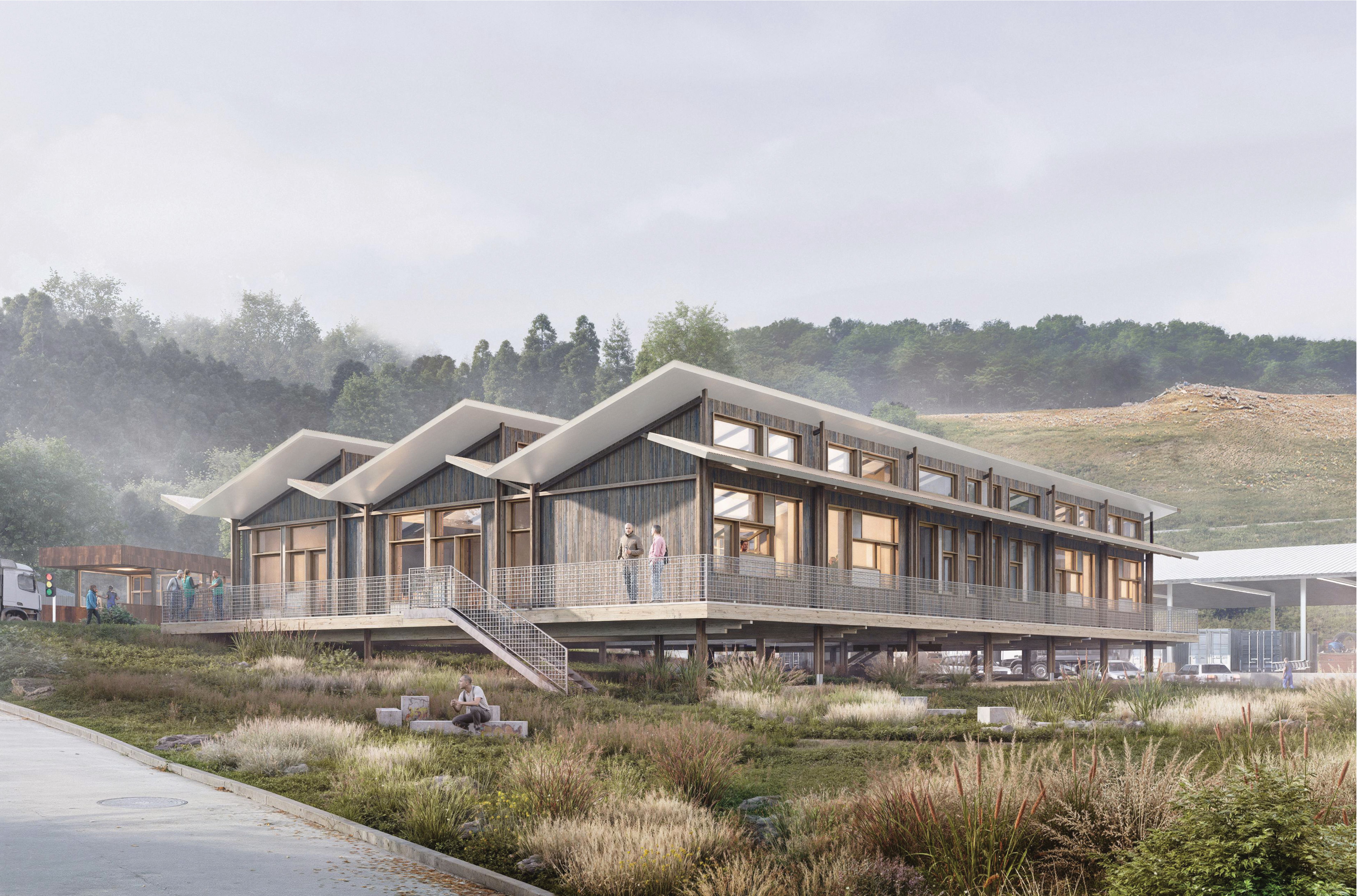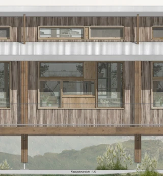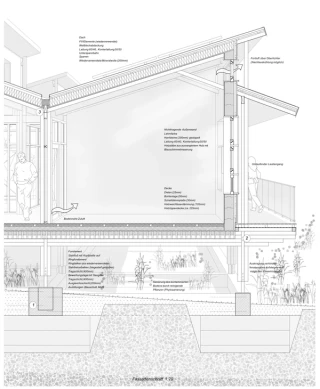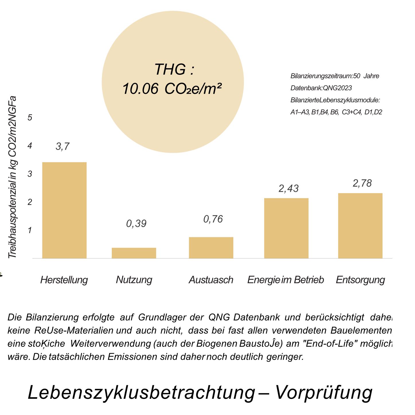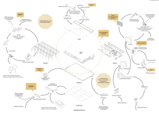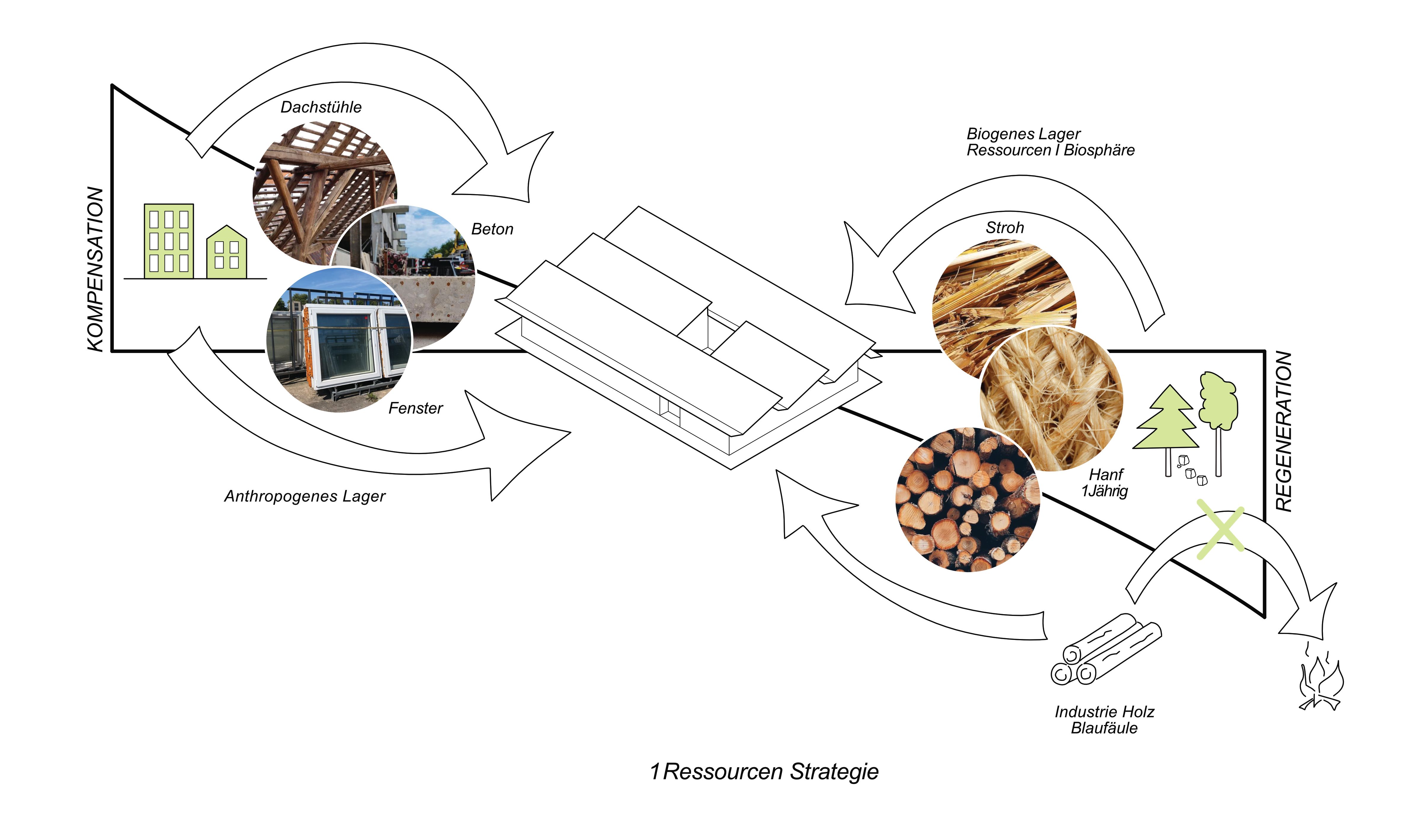The concept follows a dual strategy: the consistent use of reused materials in all component layers and the integration of renewable building materials, which are generally not used as materials but rather for thermal recovery. By combining this circular and regenerative strategy, existing building materials are reused and further processed, while biogenic CO2 is stored within the structure instead of being released into the atmosphere through thermal recovery. This enables both compensation (avoiding new emissions) and regeneration (storage of CO2 from the biosphere).