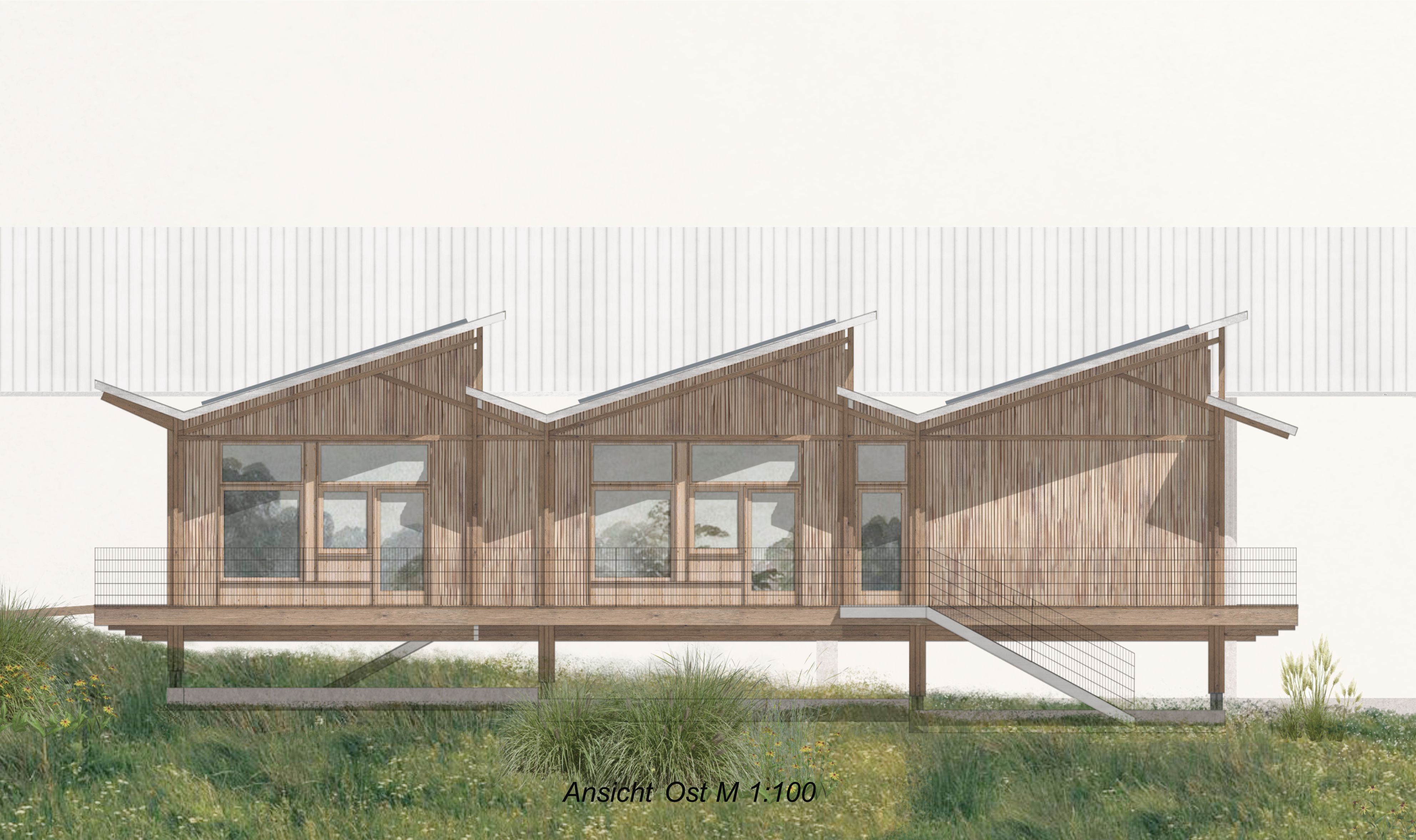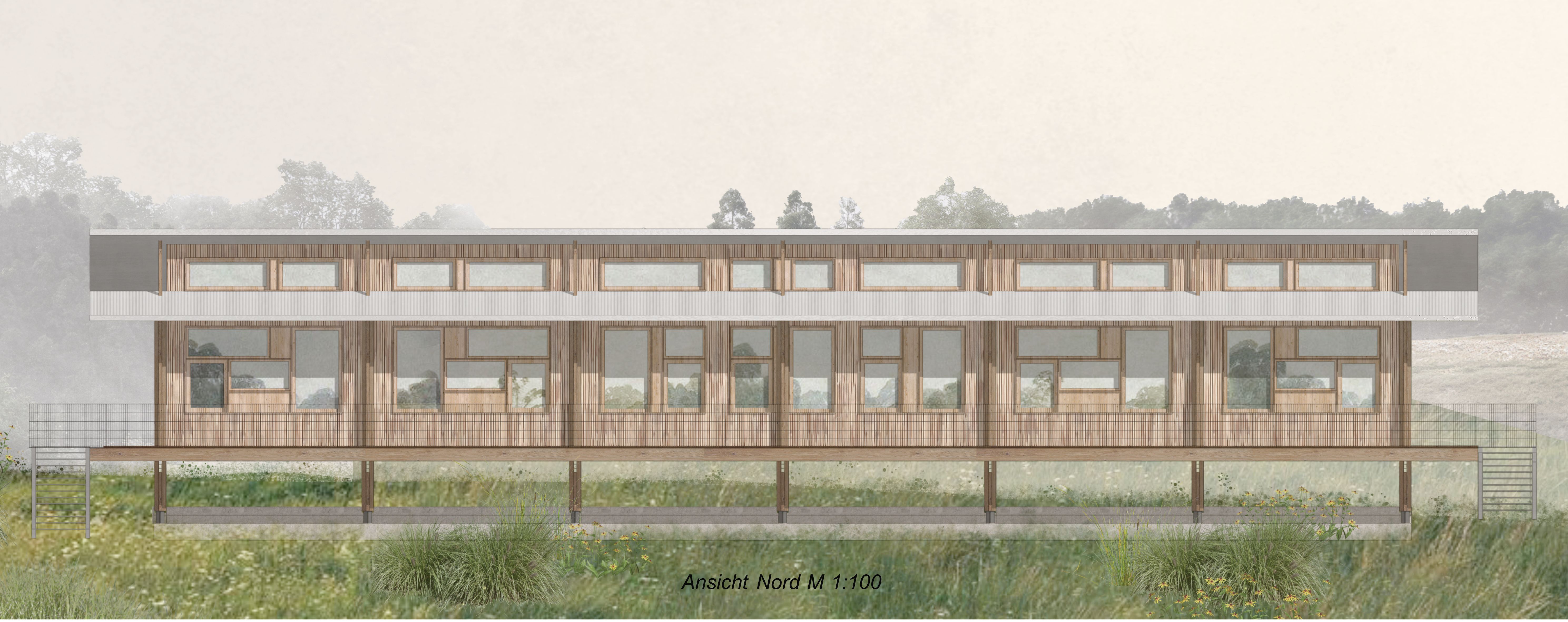 Particular attention is paid to the foundation. Due to the risk of uneven settlement described in the soil survey, individual footings are omitted. Instead, the columns rest on load-distributing concrete beams, which in turn rest on a one-meter-deep foundation pad reinforced with two layers of geotextiles. To reduce non-renewable resources, the reuse of existing concrete beams is proposed. These are joined to form a rigid foundation beam by bonding in reinforcement, welding the joints, and filling them with concrete. Increased concrete cover can be achieved by laying the beams in a mortar bed or by adding a thinner layer of fresh concrete. This significantly reduces concrete consumption – an ecological advantage.