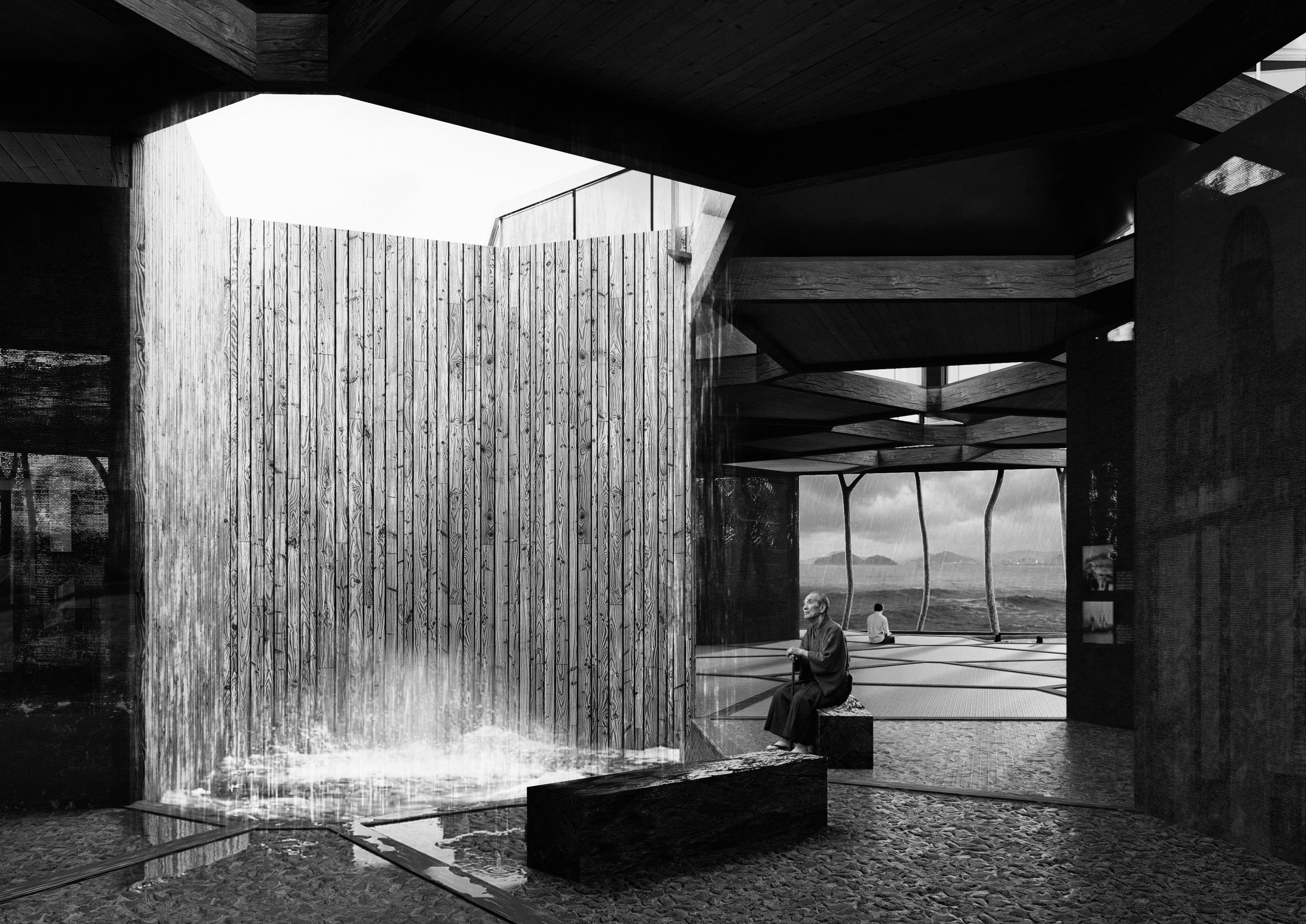 The architectural structure references historical Shinto and Buddhist temples and follows the principle of "organic metabolism"—a structure without beginning or end. Its geometry is based on irregular pentagons, which are modularly constructed. It is less a building and more a spatial sculpture for introspection and reflection.