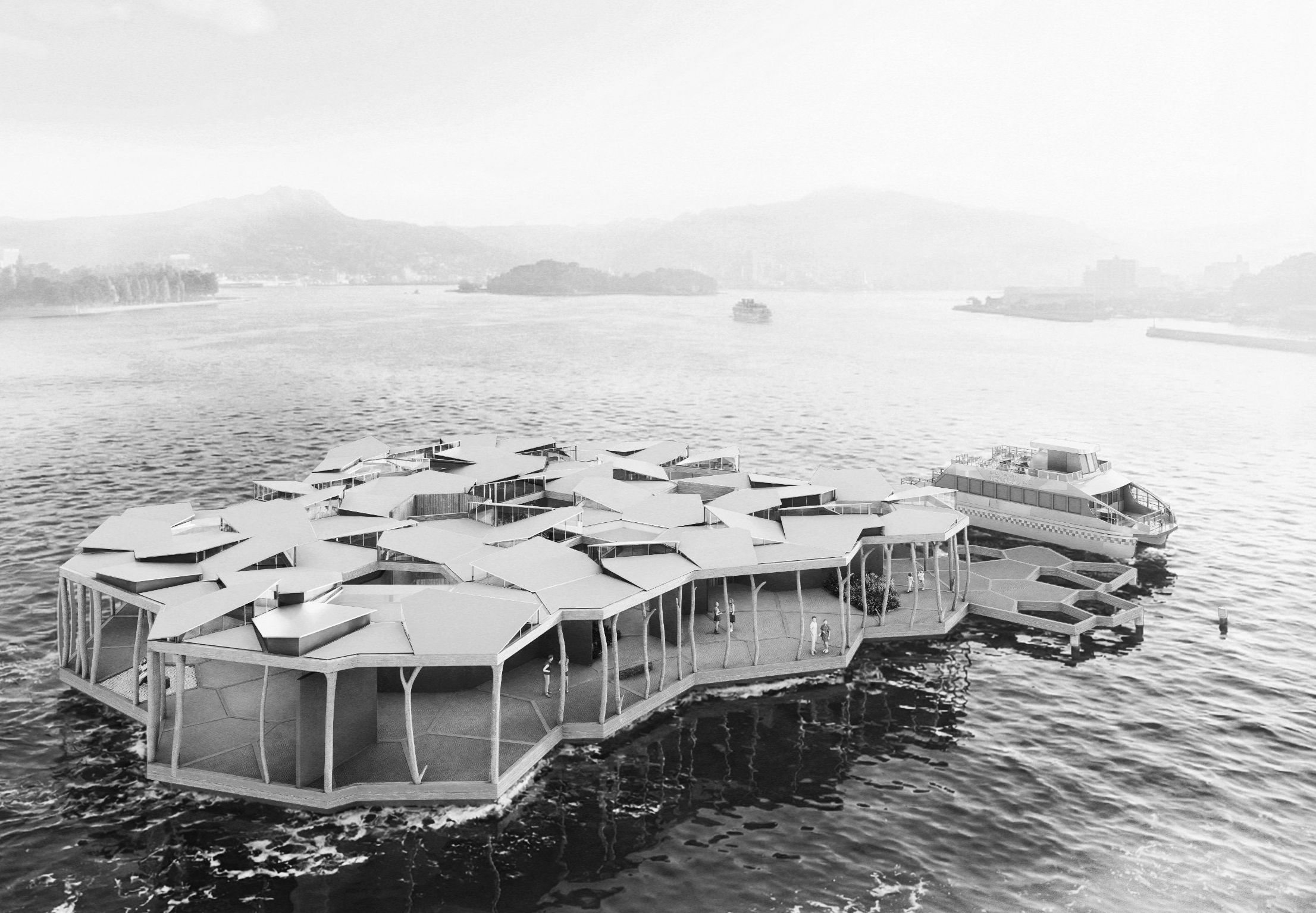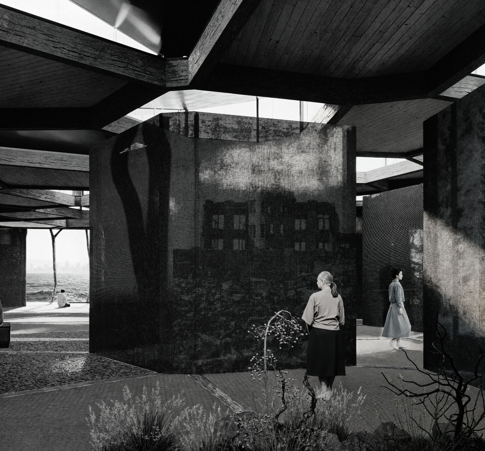 The spatial installation itself is intended to exemplify these potentials. Positioned as a floating structure in Hiroshima Bay, the project exists on the water and does not occupy or seal any land. The distance from the city creates a detached perspective on the site of the destruction and the regeneration and resilience of the inhabitants since the event 80 years ago.