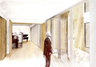 The bright, quiet building blends in carefully with its urban surroundings and becomes a dignified, restrained counterpart to the church. The fine structuring of the building creates sensitive references to the surroundings and picks up on contemporary architectural features of the region. Overall, the result is a haptically high-quality, contemplative building that makes reference to its surroundings in terms of form and choice of materials, yet conveys an independent formal presence on the site in terms of proportion and materiality.