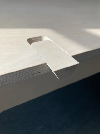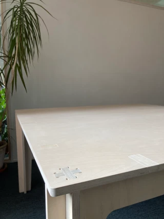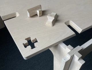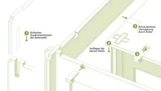 The product consists of a single commercially available building material, birch furniture plywood. It can be assembled and disassembled without tools thanks to simple plug-in connections. The modular design makes it easy to convert and reuse. Storage and transportation are space-saving and compact. The surfaces, nodes and connection points can be produced in CNC production and are therefore easily scalable. Decentralized production is possible, which shortens transport routes and decentralizes value creation. This creates added value at every point in the value chain.